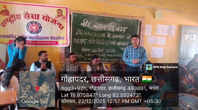गोहरापदर–:–शासकीय नवीन महाविद्यालय गोहरापदर में आज दिनांक 22 दिसंबर 2025 को, ‘वीर बाल दिवस’ (26 दिसंबर2025) के उपलक्ष्य में, राष्ट्रीय सेवा योजना (NSS) के तत्वावधान में, प्राचार्य डॉ. टी. एस. सोनवानी के निर्देशन एवं राष्ट्रीय सेवा योजना कार्यक्रम अधिकारी श्री सनत कुमार के मार्गदर्शन में व्याख्यान एवं भाषण प्रतियोगिता का आयोजन किया गया। कार्यक्रम का उद्देश्य सिखों के दशम गुरु श्री गुरु गोविंद सिंह जी के साहिबजादों के अद्वितीय बलिदान, शौर्य एवं धर्मनिष्ठा को स्मरण करना रहा।