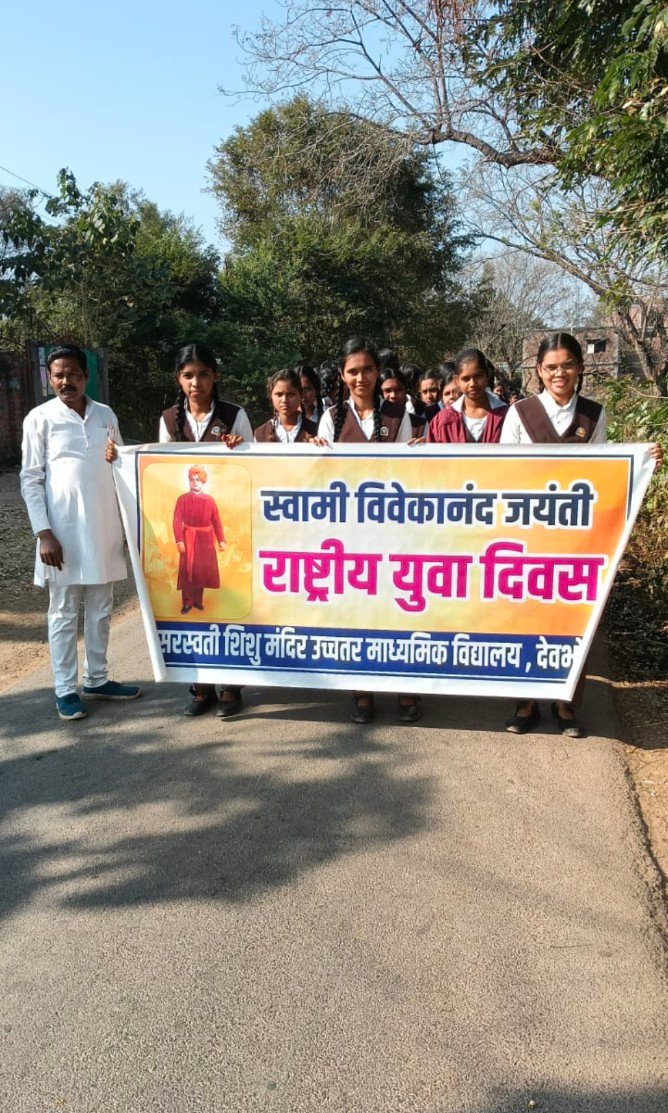 देवभोग–:–लंकेश्वरी बाल संस्कार समिति द्वारा संचालित सरस्वती शिशु मंदिर उच्चतर माध्यमिक विद्यालय देवभोग में आज दिनांक 12 जनवरी 2025 दिन सोमवार को स्वामी विवेकानंद जी के 163 वां जयंती मनाई गई, जिसमें संचालन समिति के सम्मानीय सदस्य तस्मित पात्र सुधीर भाई पटेल विजय मिश्रा प्राचार्य नरेन्द्र कुमार साहू प्रधानाचार्य मनोज रघुवंशी तथा विद्यालय के समस्त आचार्य एवं दीदीयों की उपस्थिति में मनाया गया जिसमें विद्यालय के प्राचार्य नरेन्द्र कुमार साहू तथा आचार्य हेमन्त कुमार यादव ने स्वामी विवेकानंद जी के जीवनी के बारे में विस्तार से जानकारी दी तथा पूरे नगर में स्वामी विवेकानंद के फोटो एवं नारे के साथ रैली निकाली गई जिसमें बजरंग दल विश्व हिन्दू परिषद विकास उपाध्याय अन्य आनुसांगिक दल तथा अखिल भारतीय विद्यार्थी परिषद् से तेजेस बिसी मोहन यादव नगर पंचायत उपाध्यक्ष सुशील कुमार यादव सुभाष दौरा एवं नगर के समस्त प्रतिष्ठित गणमान्य नागरिक इस रैली में शामिल थे यह जानकारी विद्यालय के प्रचार प्रसार प्रभारी राजकुमार यादव ने दी।