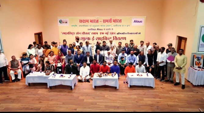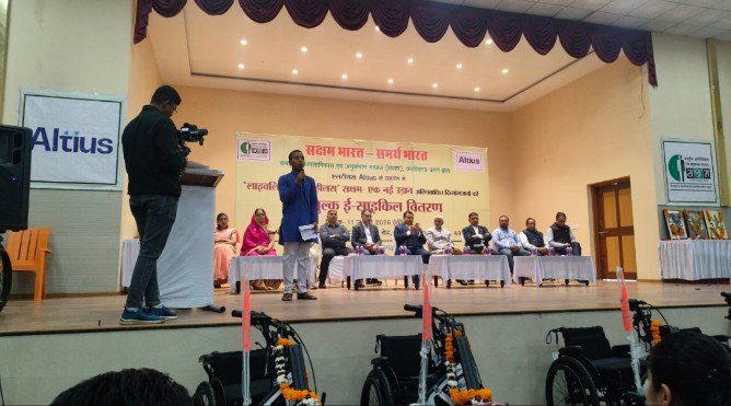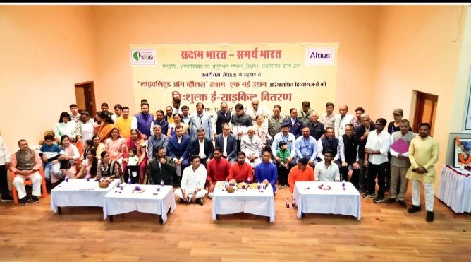 जिसमें देश भर के दिव्यांगजनों को 308 ई-साइकिल वितरण का योजना बनाया गया जिसकी कुल लागत 3 करोड़ 40 लाख के आसपास है। ई-साइकल वितरण दिव्यांगजनों को स्वावलंबी बनाने का एक प्रसास है। विगत दिनों भोपाल में 15 ई साइकल वितरण किया गया जिसमें से अब 10 दिव्यांगजन जोमेटो के साथ काम करके अपना जीवन निर्वहन कर रहें हैं। सक्षम के द्वारा सबसे ज्यादा 58 ई साईकल का वितरण छत्तीसगढ़ में किया जा रहा है। कार्यक्रम में मुख्यअतिथि के रूप में उपस्थित समाज कल्याण विभाग के सचिव एवं आयुक्त राज्य दिव्यांजन भुवनेश यादव जी द्वारा अपने उद्बोधन कहा गया की समाज कल्याण विभाग द्वारा विगत दो वर्षों में 6 लाख दिव्यांगों का चिन्हांकन किया गया, 2.65 लाख यूडीआईडी कार्ड जारी किये गये। स्वावलंबन पोर्टन के माध्यम से वर्तमान में छग के 1 लाख 67 हजार दिव्यांगजनों को पेंशन प्रदान किया जा रहा है। विगत दिनों 10,000 दिव्यांजनों को कृत्रिम अंग प्रदान करने का कार्य चल रहा है। विविध माडर्न उपकरणों के लिए 5 करोड का प्रावधान किया गया है। दिव्यांगजनों को शिक्षा और रोजगार के क्षेत्र में विशेष सहयोग के लिए छात्रवृत्ति के साथ ही समाज कल्याण विभाग द्वारा स्व रोजगार हेतु प्रशिक्षण एवं न्यूनतम ब्याज पर लोन उपलब्ध करवाया जा रहा है। बहुत से योजनाओं के माध्यम से दिव्यांगों को सक्षम बनाने का प्रयास किया जा रहा है। प्रत्येक दिव्यांग समाज के अभिन्न अंग है उनके सहयोग के बीना समाज का विकास नहीं का सकता है। हम सभी को मिलकर समावेशी समाज के निर्माण के लिए हर संभव प्रयास करना होगा। गरियाबंद पुलिस अधिक्षक देवव्रत सिरमौर जी द्वारा कहा गया कि अब कोई भी अक्षम नहीं रहेगा, सक्षम के सहयोग और साथ से हर व्यक्ति अब सक्षम होगा। वर्तमान समय मशीनों पर आधारित है, कोई भी व्यक्ति बीना मशीनरी के अपने कार्य संपादित नहीं कर सकता। दिव्यांग के रूप में जन्म लेने वाले स्टीफंस हाकिंस ने 21 साल के उम्र में मशीनरी का उपयोग कर विश्व के सबसे प्रसिद्ध वैज्ञानिक के रूप में अपना एक विशेष स्थान बनाया। रायपुर के अपर कलेक्टर उज्जवल पौडवाल जी ने कहा दिव्यांग मतलब दिव्यगुणों से महाहित होता है। उन्होनें विभिन्न उदाहरणों शीतला देवी, सुधा चन्द्रन, अरूणिमा सिन्हा, रविन्द्र जैन आदि के माध्यम से बताया कि ये वे लोग है जो सामान्य न होकर विशिष्ट गुणों के साथ जन्म लिए और दिव्यांग होते हुए समाज में अपना विशिष्ट स्थान प्राप्त किये। सक्षम के प्रदेश अध्यक्ष डॉ. सुरेन्द्र शुक्ला जी द्वारा छ.ग. सक्षम के माध्यम से 58 ई साइकल वितरण हेतु प्राप्त होना इसे एक बड़ी सफलता बताया। उन्होनें इसके लिए एल्टस को धन्यवाद ज्ञापन किया साथ ही छ.ग. प्रदेश के समस्त टीम को बधाई दिया जिन्होनें इतने कम समय मंे कड़ी मेहनत एवं प्रयास