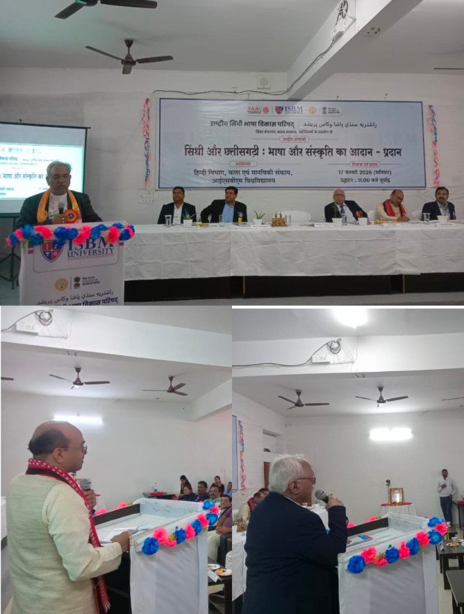 छुरा–:–आईएसबीएम विश्वविद्यालय, नवापारा (कोसमी) में राष्ट्रीय सिंधी विकास परिषद, शिक्षा मंत्रालय, भारत सरकार के विशेष सहयोग से हिन्दी विभाग, कला एवं मानविकी संकाय द्वारा “सिंधी एवं छत्तीसगढ़ी : भाषा एवं संस्कृति का आदान-प्रदान” विषय पर एक दिवसीय राष्ट्रीय संगोष्ठी का सफल आयोजन शनिवार को किया गया। इस संगोष्ठी में भारतीय भाषाओं की साझा सांस्कृतिक विरासत, लोकपरंपराओं और भाषायी संवाद पर चर्चा-परिचर्चा की गई। विद्यार्थी बुक डिपो एवं जनरल स्टोर्स, भिलाई 3, और सागर इंटरप्राइजेस, छुरा का इस कार्यक्रम के लिए विशेष सहयोग किया।
