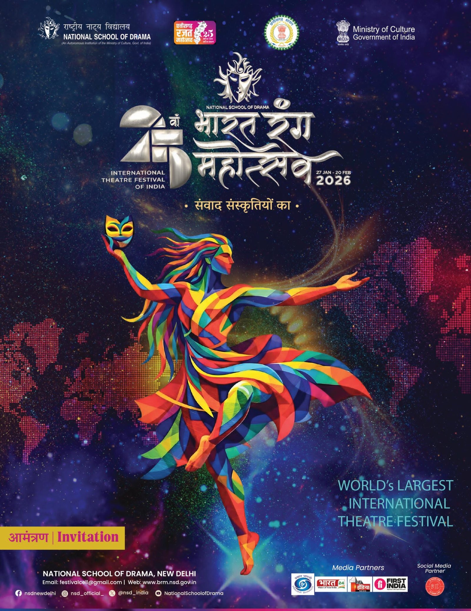 राष्ट्रीय नाट्य विद्यालय, नई दिल्ली द्वारा आयोजित यह प्रतिष्ठित महोत्सव 3 फरवरी से 8 फरवरी 2026 तक पं. दीनदयाल उपाध्याय ऑडिटोरियम, रायपुर में संपन्न होगा।