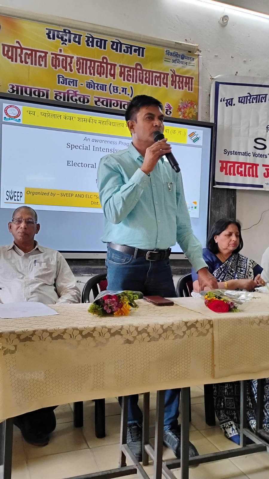 कोरबा–:–भारत निर्वाचन आयोग, नई दिल्ली एवं मुख्य निर्वाचन पदाधिकारी, छत्तीसगढ़ के निर्देशानुसार जिले के युवाओं को निर्वाचन प्रक्रिया के प्रति जागरूक करने हेतु दिनांक 18 फरवरी 2026 को सहायक जिला स्वीप नोडल अधिकारी सतीश प्रकाश सिंह की उपस्थिति में “स्व प्यारे लाल कंवर” शासकीय महाविद्यालय भैसमा में इलेक्टोरल लिटरेसी क्लब (ELC) का गठन किया गया। इस अवसर पर छात्र-छात्राओं के लिए रंगोली प्रतियोगिता का आयोजन किया गया। रंगोली प्रतियोगिता में महाविद्यालय की छात्राओं ने बढ़-चढ़कर हिस्सा लिया। छात्राओं ने आकर्षक रंगोली बनाकर “इलेक्टोरल लिटरेसी क्लब (ELC), विशेष गहन पुनरीक्षण (SIR) और मतदान के महत्व को प्रभावी ढंग से प्रदर्शित किया। इस अवसर पर सहायक जिला स्वीप नोडल अधिकारी सतीश प्रकाश सिंह ने छात्र-छात्राओं को संबोधित करते हुए एस.आई.आर.का महत्व बताया तथा 18 वर्ष की आयु पूर्ण करने वाले प्रत्येक युवा को एक जागरूक मतदाता के रूप में अपने मतदान केंद्र में अपना नाम पंजीकृत कराने के लिए प्रेरित किये। उन्होंने लोकतंत्र की मजबूती के लिए युवाओं के योगदान को महत्वपूर्ण बताया । सहायक जिला स्वीप नोडल अधिकारी सतीश प्रकाश सिंह ने इलेक्टोरल लिटरेसी क्लब के गठन के उद्देश्यों को विस्तार से बताया तथा युवाओं से लोकतंत्र की मज़बूती के लिए आगे आकर अपना योगदान देने के लिए प्रेरित किये।