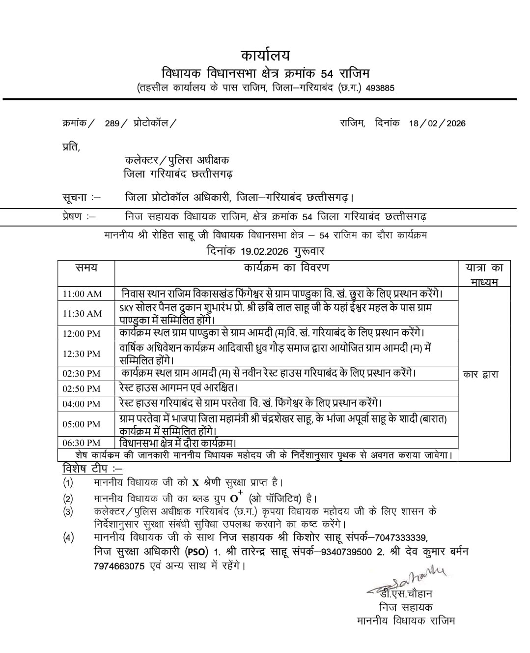 होंगे। इसके बाद शाम 4:00 बजे रेस्ट हाउस से ग्राम परतेवा विकासखंड फिंगेश्वर के लिए प्रस्थान करेंगे। उन्होंने सभी कार्यकर्ताओं से निवेदन किया है कि वे उक्त कार्यक्रम में शामिल होवे।