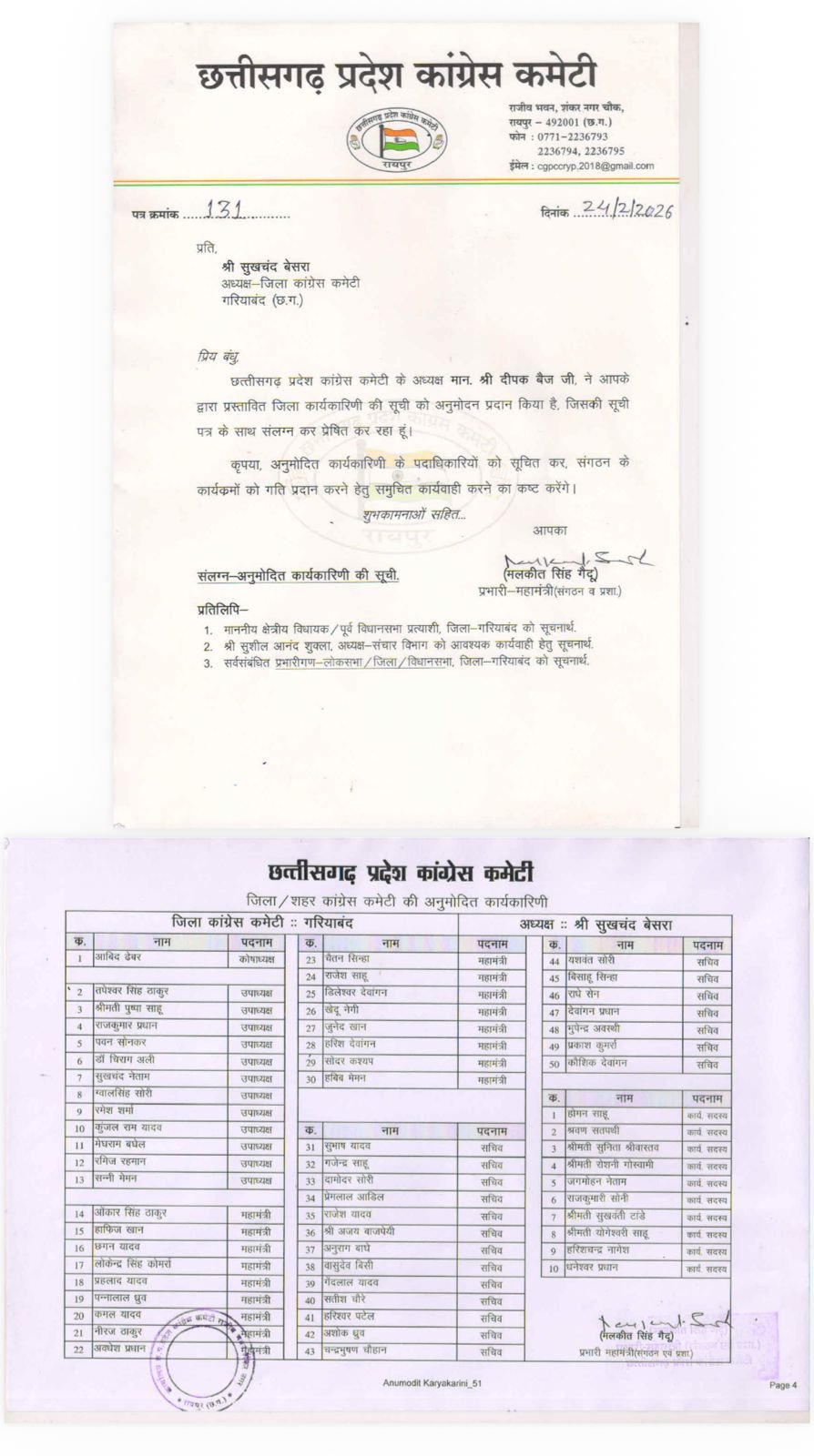 गरियाबंद–:– जिला कांग्रेस कमेटी गरियाबंद का संगठनात्मक विस्तार करते हुए नई कार्यकारिणी की घोषणा कर दी गई है। सूची को प्रदेश कांग्रेस कमेटी अध्यक्ष दीपक बैज ने अनुमोदित कर जारी किया। सभी नाम जिला अध्यक्ष सुखचंद बेसरा द्वारा प्रस्तावित किए गए थे, जिन्हें प्रदेश नेतृत्व की स्वीकृति के बाद औपचारिक रूप से घोषित किया गया।