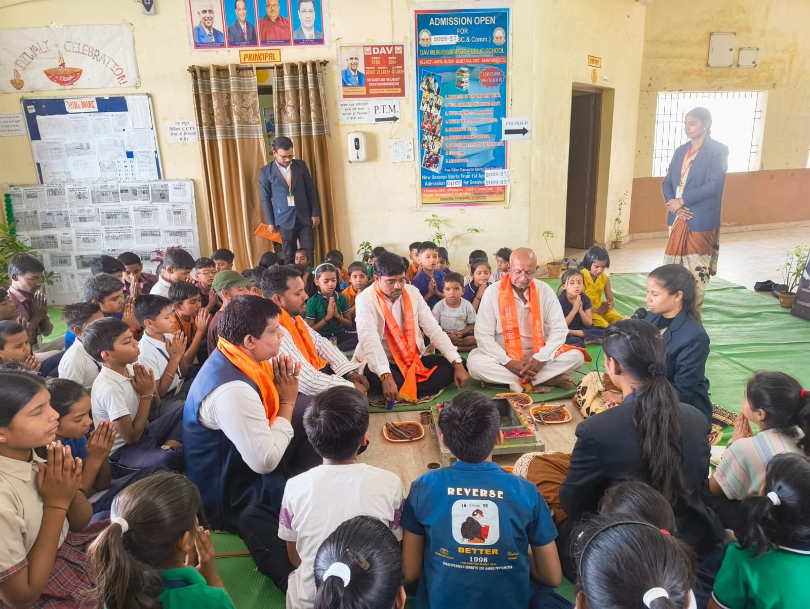 साथ ही सभी अभिभावकों,माता पिता व अथितियों का भी तिलक व पुष्प वर्षा के साथ स्वागत किया गया। स्वागत के बाद सभी अतिथियों व स्कूल प्रचार्य ने वैदिक हवन यज्ञ में शामिल हुए,व स्वामी दयानंद सरस्वती , महात्मा हंसराज व सरस्वती माता को श्रद्धा सुमन, पुष्पगुच्छ व माला पहनाते हुए दिप प्रज्वलित किए ततपश्चात सरस्वती वन्दना गीत एवं डी ए वी गान के साथ कार्यक्रम का शुभारंभ किया गया। कार्यक्रम के मुख्यअतिथि विजय सिंहा के द्वारा बच्चों को शाला प्रवेशोत्सव की शुभकामनाएं दिए उद्बोधन में विद्यार्थियों को नवीन सत्र की शुभकामनाएं देते हुए उन्हें शिक्षा के साथ-साथ नैतिक मूल्यों के पालन हेतु प्रेरित किया। उन्होंने कहा कि शिक्षा मनुष्य के जीवन का आधार है तथा सतत परिश्रम, अनुशासन एवं समर्पण से ही सफलता प्राप्त की जा सकती है।